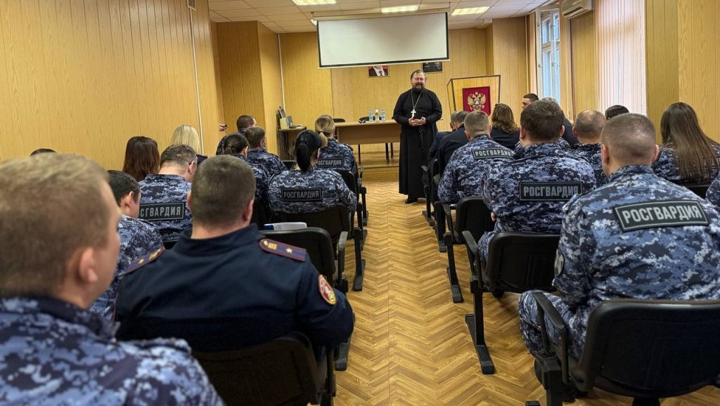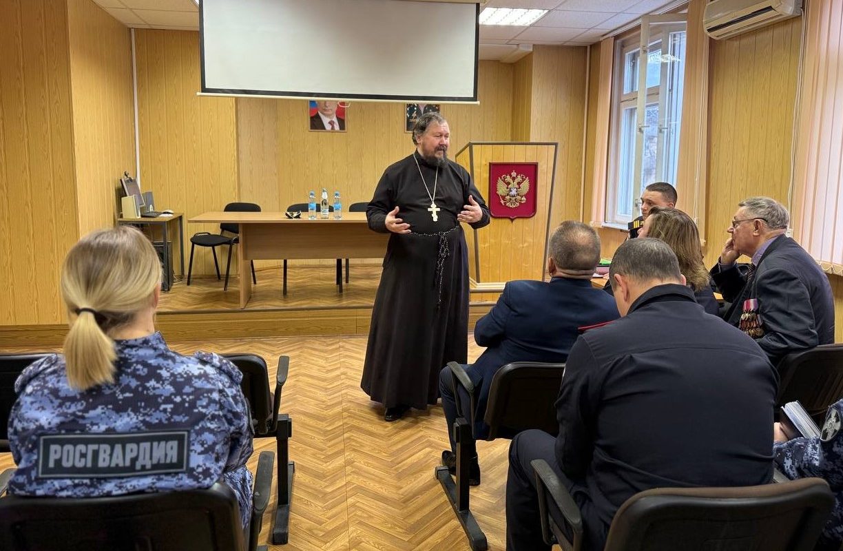 Накануне праздника Дня Героя Отечества 1 декабря 2025г. священник Владимир Матвеев, клирик храма свв. бесср. Космы и Дамиана в Космодемьянском г. Москвы провел очередную беседу в Межрайонном отделе вневедомственной охраны по САО ФГКУ «УВО ВНГ России по г. Москве».